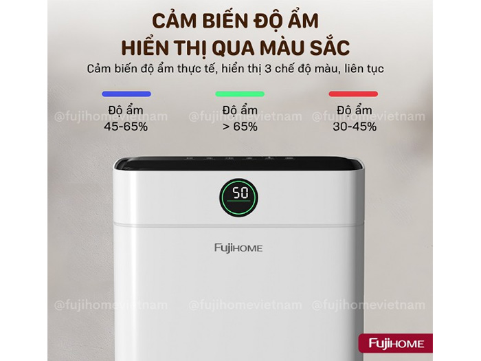 DH18W-HEPA sẽ hiển thị độ ẩm thông qua màu sắc với các mức độ: Xanh (≤ 45%), xanh lá (45% – 65%) và đỏ (> 65%).