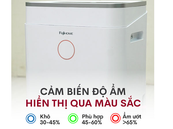 Máy hỗ trợ hiển thị độ ẩm theo màu sắc đèn LED giúp người dùng nhận biết độ ẩm theo thời gian thực trong phòng: