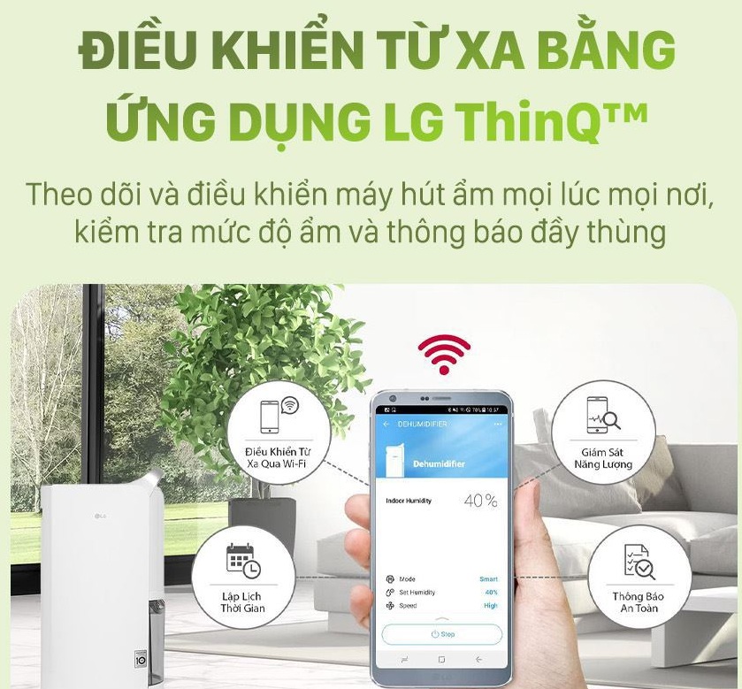 – Ngoài ra, thông qua ứng dụng LG ThinQ™ trên điện thoại, bạn có thể điều khiển máy hút ẩm và kiểm tra độ ẩm cũng như nhận thông báo khi nước đầy bình chứa, thiết lập thời gian bật/tắt tự động,… ở bất cứ đâu và bất cứ lúc nào.