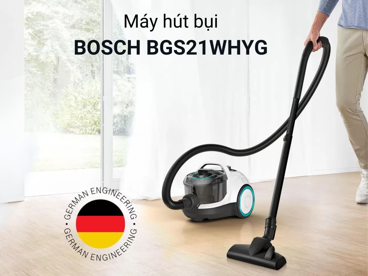 Máy hút bụi Bosch BGS21WHYG được trang bị động cơ mạnh mẽ với công suất tối đa lên đến 2000W giúp làm sạch nhanh chóng và hoàn hảo.