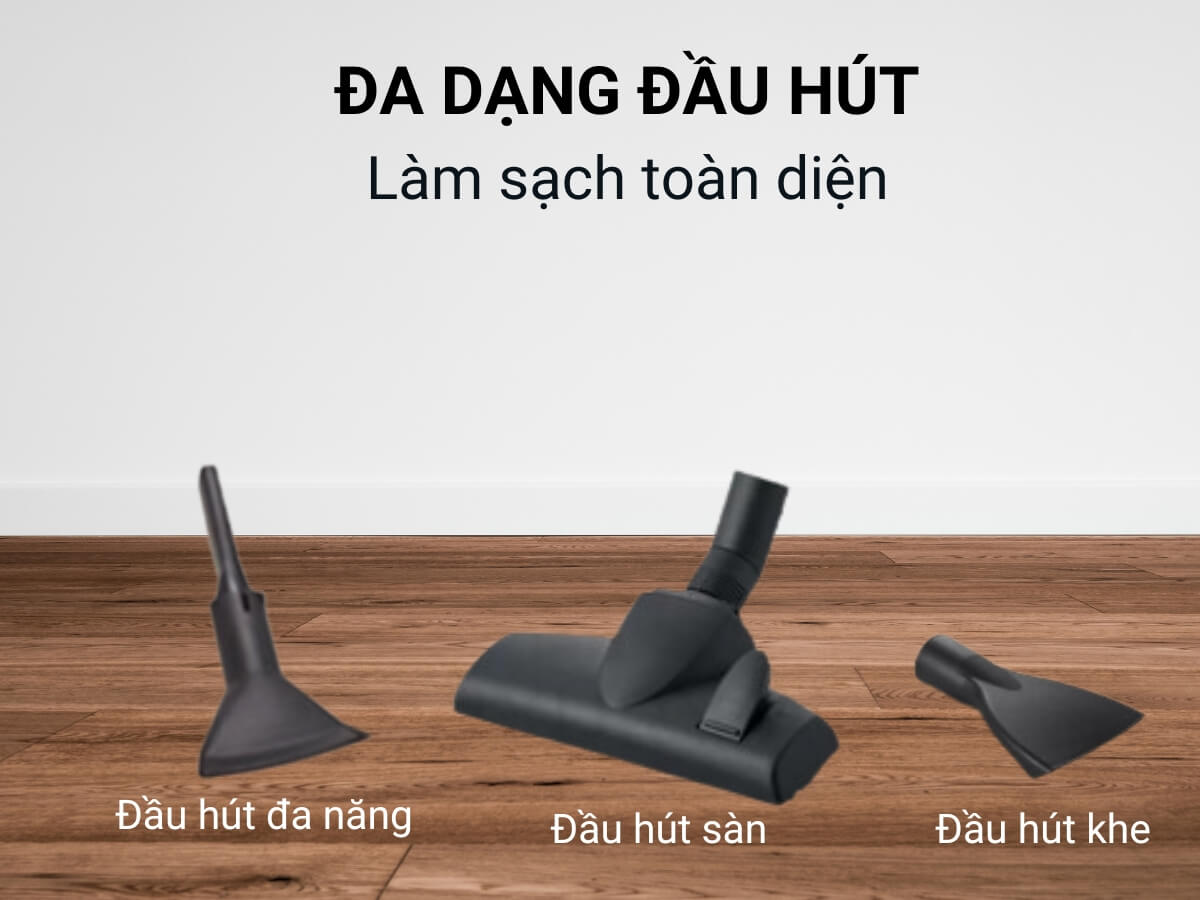 Máy hút bụi này trang bị đầu hút đa năng tăng khả năng hút sạch bụi hiệu quả trên nhiều loại bề mặt. Máy còn kèm theo đầu hút đa năng, đầu hút sàn, đầu hút thảm.