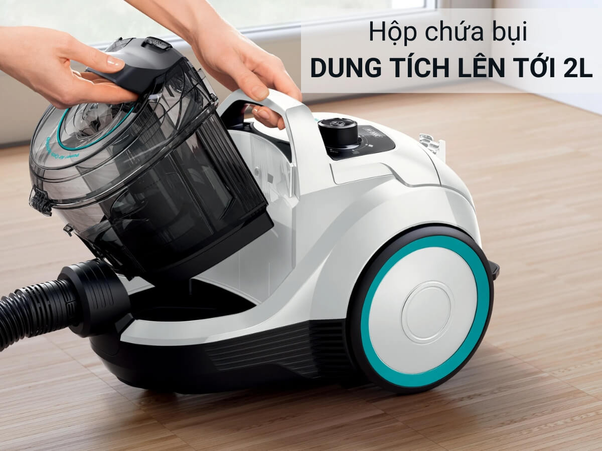 Hộp chứa bụi có dung tích 2 lít giúp bạn thoải mái dọn dẹp, làm sạch không gian sống mà không cần lo lắng phải đổ bụi nhiều lần.