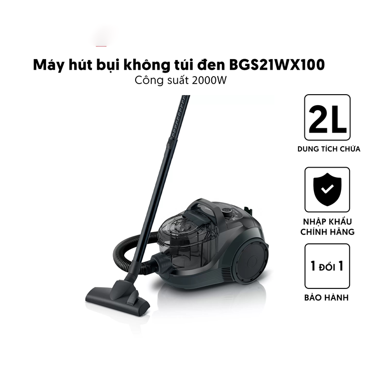 Máy hút bụi có dây Bosch BGS21WX100 được thiết kế hiện đại, màu sắc đen mang đến sự sang trọng quý phái cho ngôi nhà của bạn.