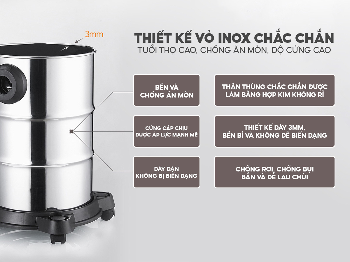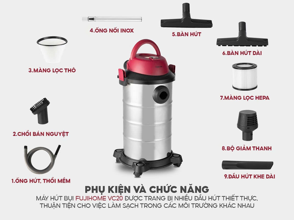 Fujihome VC20 là một máy hút bụi công nghiệp đa năng với điện năng tiêu thụ chỉ 1000watt/Max 1200W – motor công nghệ Italy – lõi đồng có khả năng hút bụi, hút nước đảm bảo lực hút ổn định và làm việc hiệu quả được trong thời gian dài. Với công suất cực mạnh lên đến 1200W, động cơ mạnh mẽ cùng lực hút nhanh và khỏe giúp làm sạch mọi không gian một cách nhanh . Mặc dù lượng tiêu thụ thấp, thiết bị này mạnh mẽ như một máy hút bụi 1500-watt. Thân máy bằng inox chống gỉ sét, chịu va đập mạnh, di chuyển trên 04 bánh xe được thiết kế tiện lợi di chuyển . Máy được trang bị túi lọc , màng lọc HEPA tiên tiến cho khả năng lọc bụi mạnh mẽ trả lại bầu không khí trong lành . Đi kèm với phụ kiện bàn hút sàn ,đầu hút các kẽ hở , bàn hút nước, bàn hút tròn cho phép bỏ các loại bụi bẩn khác nhau một cách hiệu quả.