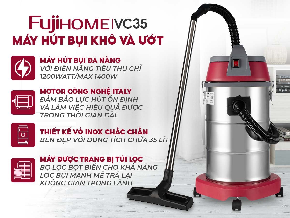Máy hút bụi khô và ướt công nghiệp Fujihome VC35 là sản phẩm chuyên dụng dùng cho nhà hàng, khách sạn, công ty, nhà xưởng, dịch vụ vệ sinh : hút khô và hút ướt các bụi bận khó làm sạch.Thiết kế công nghiệp, độ bền cao, mẫu mã đẹp, hiệu suất ổn định.