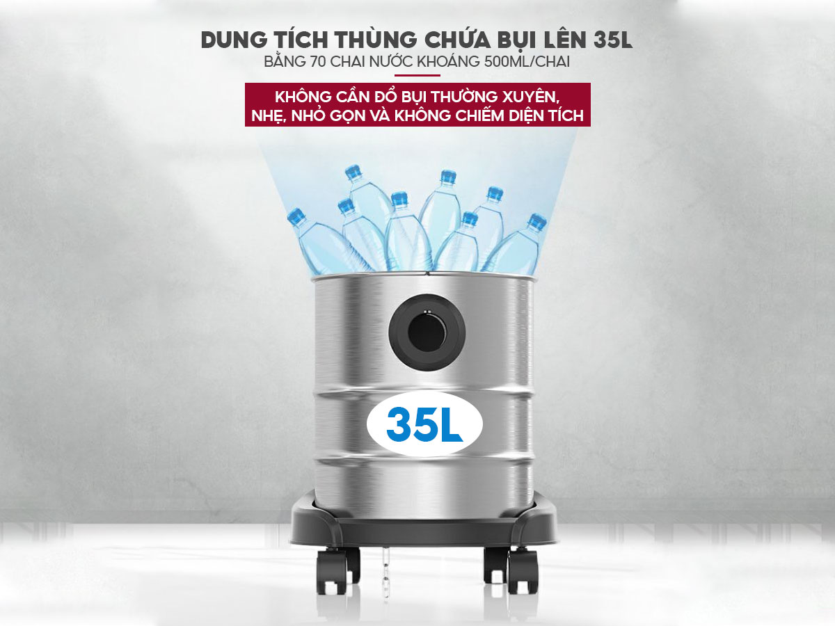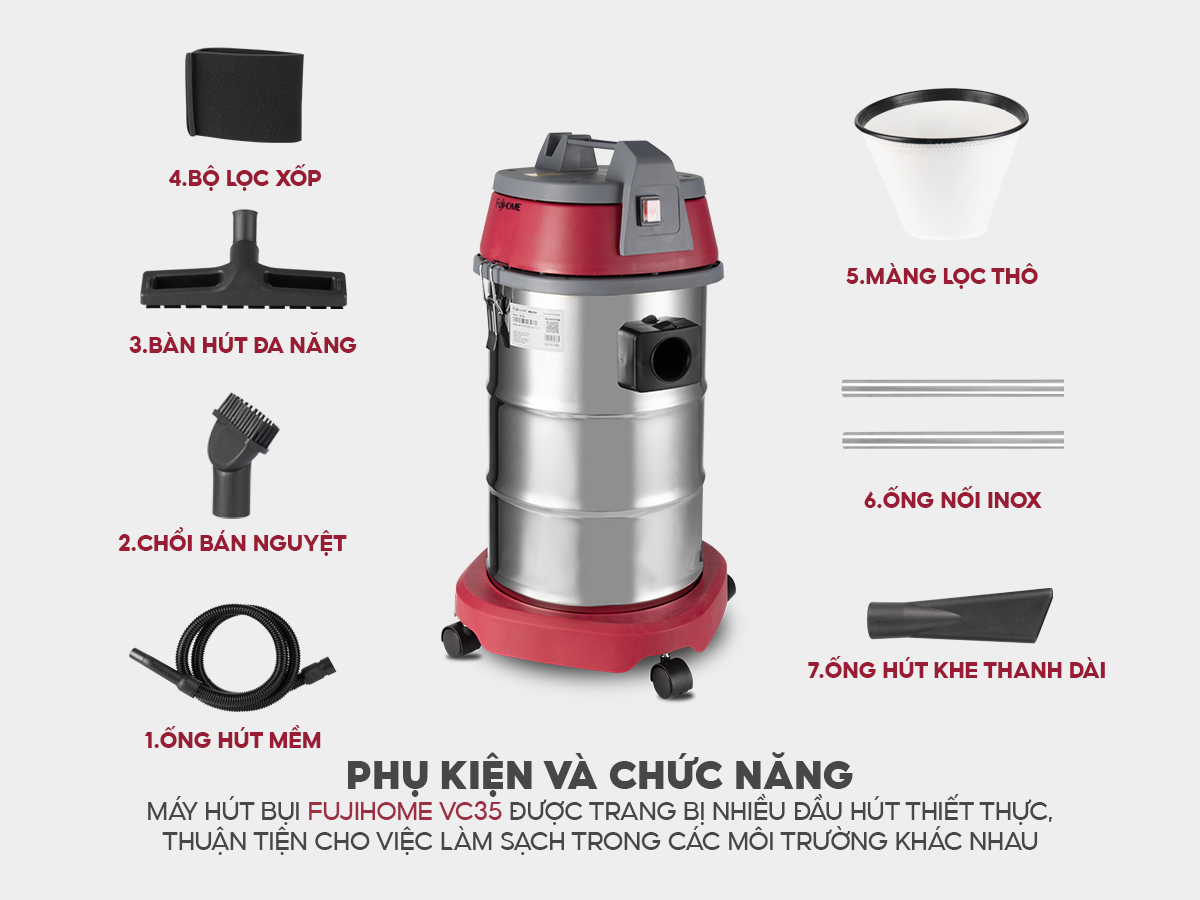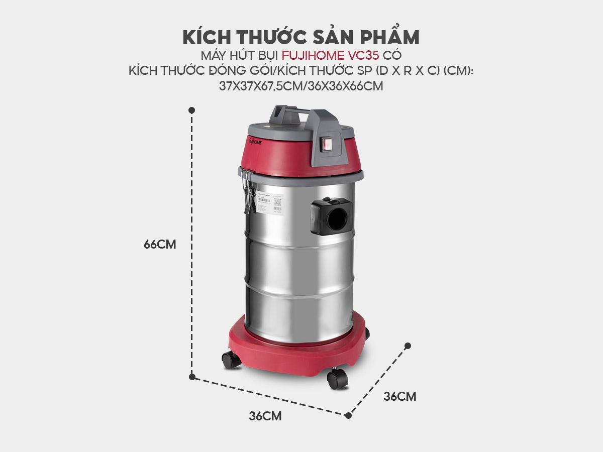 Fujihome VC35 là một máy hút bụi công nghiệp công suất lớn, điện năng tiêu thụ chỉ 1200watt/Max 1400W – motor công nghệ Italy – 100% lõi đồng có khả năng hút bụi, hút nước đảm bảo lực hút ổn định và làm việc hiệu quả được trong thời gian dài. Với công suất cực mạnh từ 1200W-1400W, động cơ mạnh mẽ cùng lực hút nhanh và khỏe giúp làm sạch mọi không gian một cách nhanh chóng.Thân máy bằng inox chống gỉ sét, chịu va đập mạnh, di chuyển trên 04 bánh xe được thiết kế tiện lợi di chuyển . Máy được trang bị túi lọc , bộ lọc bọt biển cho khả năng lọc bụi mạnh mẽ trả lại không gian trong lành . Đi kèm với phụ kiện bàn hút sàn ,đầu hút các kẽ hở , bàn hút nước, bàn hút tròn cho phép bỏ các loại bụi bẩn khác nhau một cách hiệu quả .