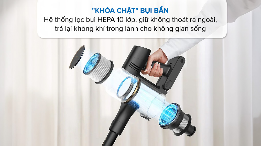 – Bộ lọc HEPA 10 lớp giúp lọc sạch bụi bẩn nhanh chóng, có thể rửa sạch bằng nước dễ dàng.