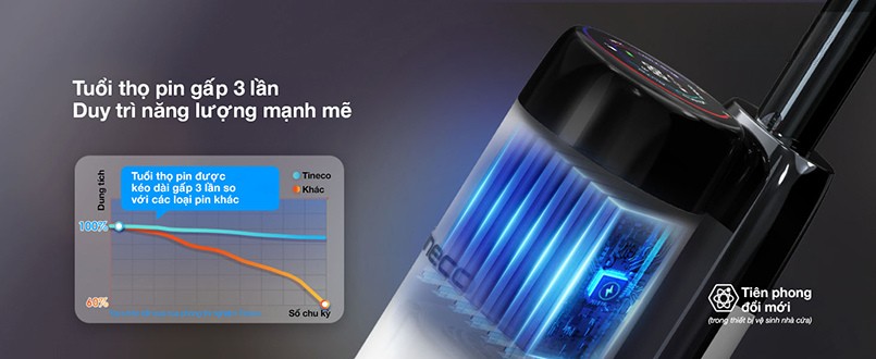 Tineco S6 Stretch Pro sử dụng pin mềm dạng túi với cấu trúc linh hoạt, giúp tối ưu hóa khả năng dẫn điện và tản nhiệt. Nhờ đó, pin có tuổi thọ cao gấp 3 lần so với các loại pin thông thường và có thể duy trì hiệu suất ổn định trong thời gian dài. Máy hoạt động liên tục lên đến 40 phút, đủ để bạn làm sạch toàn bộ không gian sống mà không cần lo lắng về việc hết pin giữa chừng.