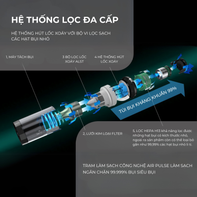 Tự động loại bỏ bụi bẩn và sạc pin cùng lúc. Trạm làm sạch với công nghệ “Air Pulse” giúp làm sạch hộp chứa bụi hiệu quả* và tự động đóng nắp hộp chứa sau khi làm sạch. Trạm tích hợp Hệ thống lọc đa lớp ngăn chặn 99.999% bụi siêu mịn** thoát ra ngoài, cùng túi bụi kháng khuẩn 99.9% đảm bảo không khí xả ra từ máy là không khí sạch hoàn hảo. Luồng xoáy chính và bộ lọc lưới kim loại sẽ giúp lọc và giữ các lại các hạt bụi có kích thước lớn. Sau đó, hệ thống hút lốc xoáy với bộ vi lọc giúp lọc sạch các hạt bụi nhỏ.