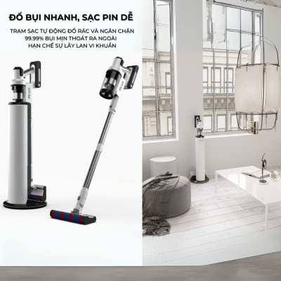 Tự động loại bỏ bụi bẩn và sạc pin dễ dàng. Trạm làm sạch với công nghệ “Tự động đổ rác AUTO EMPTY” giúp làm sạch hộp chứa bụi hiệu quả*, đồng thời sạc đầy pin cùng lúc. Trạm tích hợp Hệ thống lọc đa lớp ngăn chặn 99.999% bụi siêu mịn** thoát ra ngoài, cùng túi bụi kháng khuẩn 99.9%*** giúp hạn chế sự lây lan của vi khuẩn khi chứa bụi.