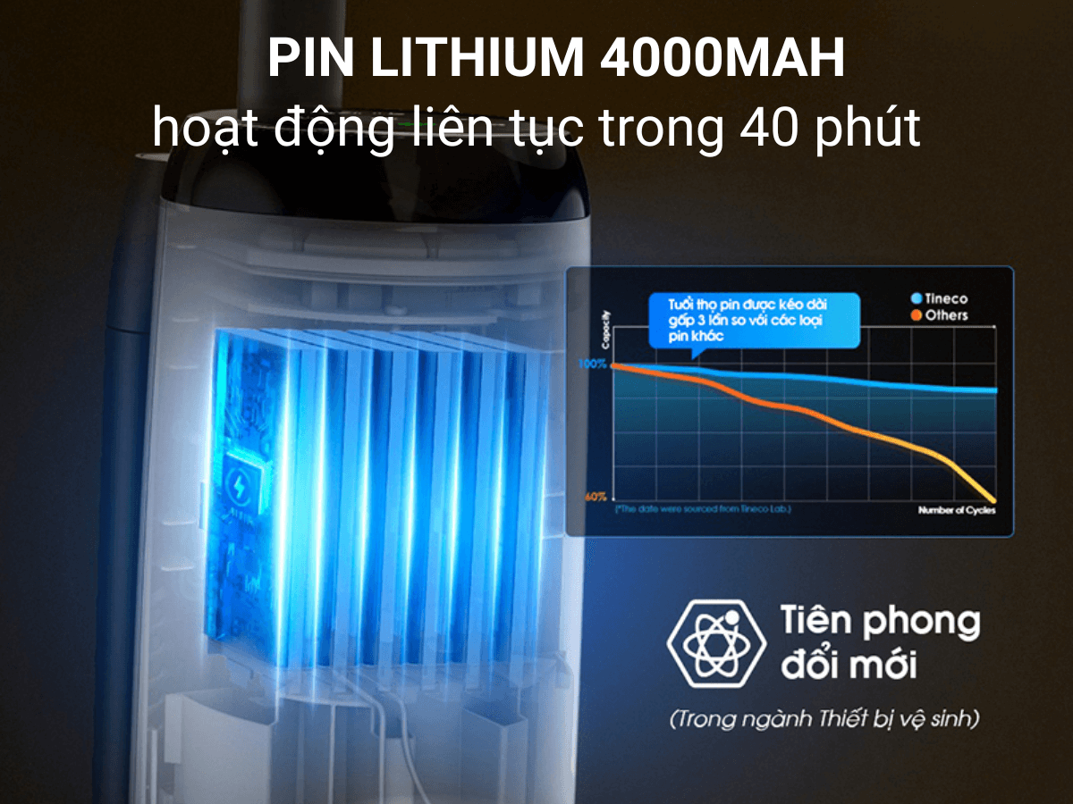 Máy hút bụi lau nhà Tineco Floor One Stretch S6 sử dụng loại pin mềm với tuổi thọ lâu gấp 3 lần so với pin truyền thống. Dung lượng pin 4000mAh, có thể hoạt động liên tục trong 40 phút mà không yêu cầu sạc lại. Do đó, bạn có thể thoải mái lau dọn nhà mà không lo hết pin giữa chừng. Thời gian sạc đầy pin khoảng 4 giờ.