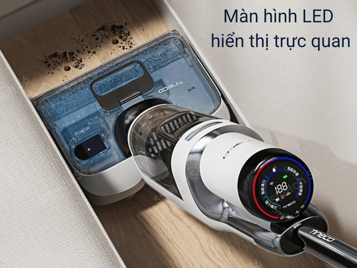 Trên thân máy của Tineco Floor One Stretch S6 còn được trang bị màn hình LED chất lượng cao. Màn hình sắc nét, hiển thị rõ ràng và đầy đủ các trạng thái làm việc như: công suất hút, dung lượng pin, mức độ bẩn cùng các chế độ thông báo như nước đầy, hết nước… một cách sinh động, trực quan, dễ nhìn, dễ hiểu. Từ đó người dùng dễ dàng nắm bắt quá trình hoạt động của máy và có những điều chỉnh kịp thời khi cần.
