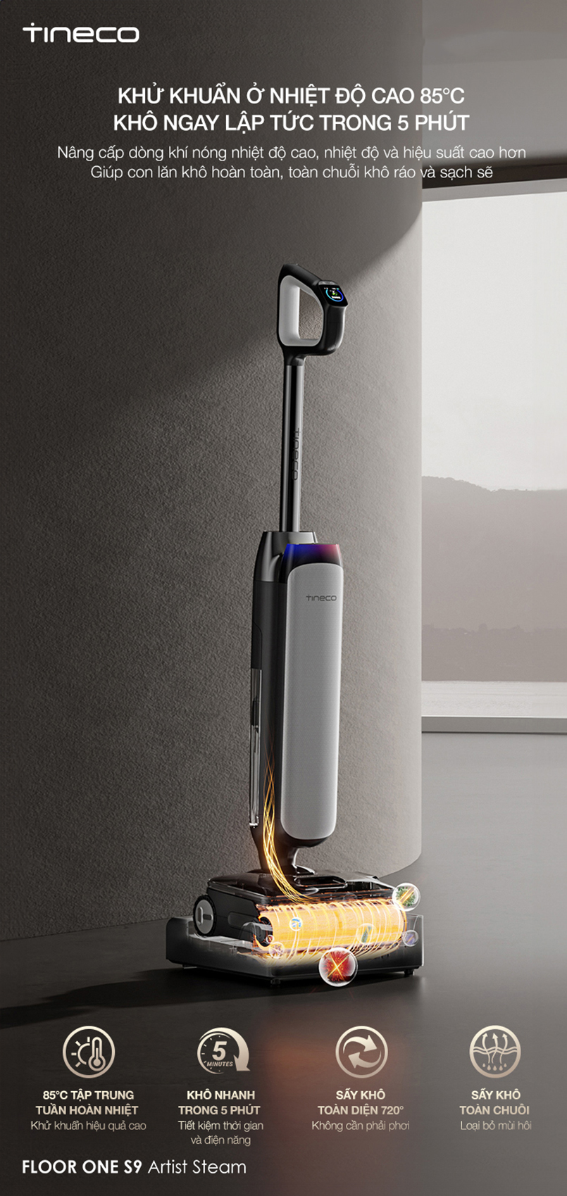 Tineco Floor One S9 Artist được trang bị hệ thống FlashDry, giúp tự động làm sạch và sấy khô chổi lau nhanh chóng ở nhiệt độ 85°C. Điều này không chỉ giúp chổi lau khô ráo, tránh mùi hôi, mà còn đảm bảo vệ sinh tốt hơn cho không gian sử dụng.