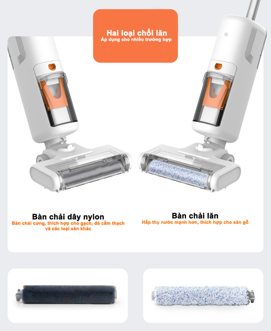 Hai chế độ lau khô và ướt được chuyển đổi dễ dàng tùy vào điều kiện mặt sàn. Máy lau sàn này cũng được tích hợp hai chổi lau là chổi nylon và chổi lăn, thích hợp làm sạch cho mọi mặt sàn khác nhau. Trong đó chổi sợi nylon thích hợp cho các bề mặt như sàn gạch, đá cẩm thạch,…Bàn chải lăn với khả năng hấp thụ nước mạnh hơn thích hợp được sử dụng cho sàn gỗ.