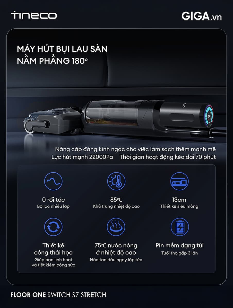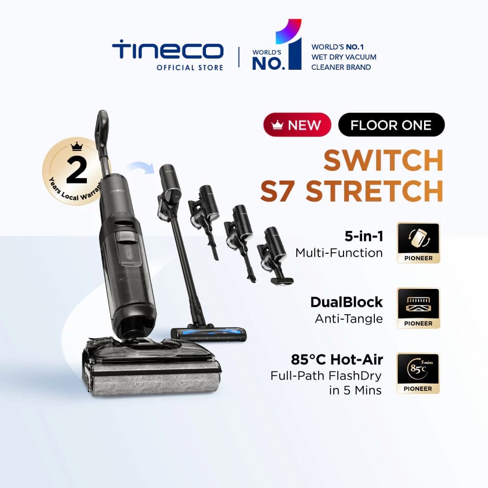 Tineco Floor One Switch S7 Stretch là công cụ vệ sinh 5 trong 1, kết hợp chức năng lau sàn, hút bụi, vệ sinh khe hở, chăm sóc bề mặt mềm và phủi bụi tầm cao thành một thiết bị nhỏ gọn. Được thiết kế để thay thế máy hút bụi truyền thống, sản phẩm này dễ dàng xử lý các vết bẩn ướt và khô, bao gồm cả vết dầu mỡ và các mảnh vụn khó làm sạch. Floor One Switch S7 Stretch cách mạng hóa việc vệ sinh sàn với khả năng rửa tiên tiến. Với lực hút 22KPa, nó dễ dàng nâng bụi bẩn, mảnh vụn và tóc, đảm bảo làm sạch sâu và kỹ lưỡng mọi lúc. Giống như Floor One S9 Artist , nó có MHCBS , rửa sạch bàn chải bằng nước sạch 450 lần mỗi phút để đảm bảo sàn nhà không tì vết. Thiết kế nằm phẳng 180° và Công nghệ HyperStretch cho phép nó làm sạch dưới đồ nội thất và tiếp cận những không gian chật hẹp thấp tới 13cm. Máy hút bụi lau sàn Tineco Floor One Switch S7 Stretch thiết kế chống rối hai khối của nó ngăn ngừa tóc rối, trong khi khả năng làm sạch cạnh hai mặt đảm bảo không bỏ sót bất kỳ góc nào. Hệ thống tự làm sạch FlashDry sử dụng nước sạch được đun nóng đến 85°C, kết hợp với không khí nóng, để hòa tan vết bẩn và làm khô bàn chải chỉ trong 5 phút, giữ cho bàn chải luôn tươi mới và không có mùi.