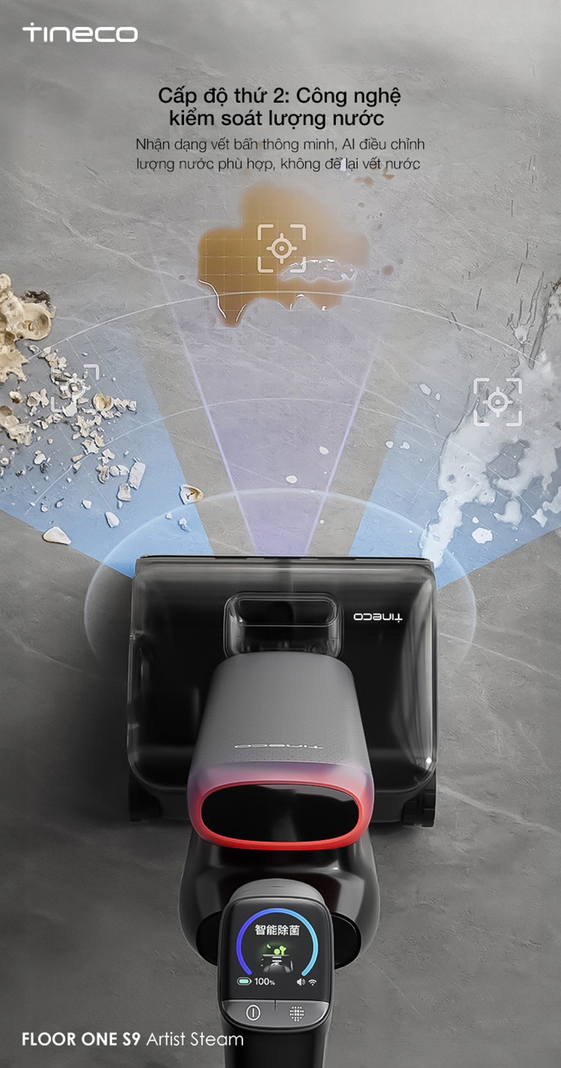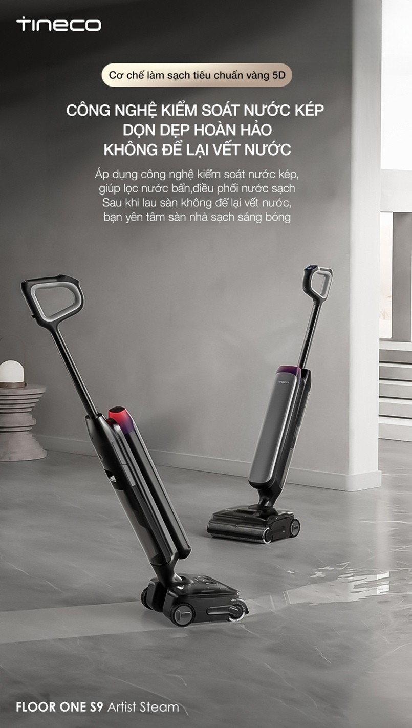 Điểm độc đáo tiếp theo của Tineco Floor One S9 Artist Steam chính là được áp dụng công nghẹ kiểm soát nước kép, giúp phân phối lượng nước sạch một cách thích hợp, đồng thời hút sạch cả vết bẩn dạng rắng và lỏng.