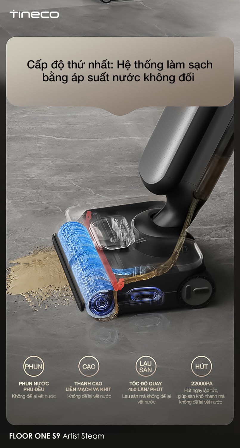 Quy trình làm sạch này đã quá quen thuộc đối với tín đồ nhà Tineco: Tineco Floor One S9 Artist Steam sẽ được cung cấp nước sạch liên tục, giúp chổi lăn luôn giữ độ ẩm lý tưởng. Khi đến quy trình lau sàn, thanh cạo phẳng sẽ cạo nước thải ngay lập tức, loại bỏ tức thì các vết bẩn bám trên chổi lau, cho sàn nhà luôn sáng bóng. Quy trình làm sạch này diễn ra liên tục với tần suất 450 lần/phút, kết hợp với lực hút 22.000Pa, giúp sàn khô nhanh mà không để lại vết nước.
