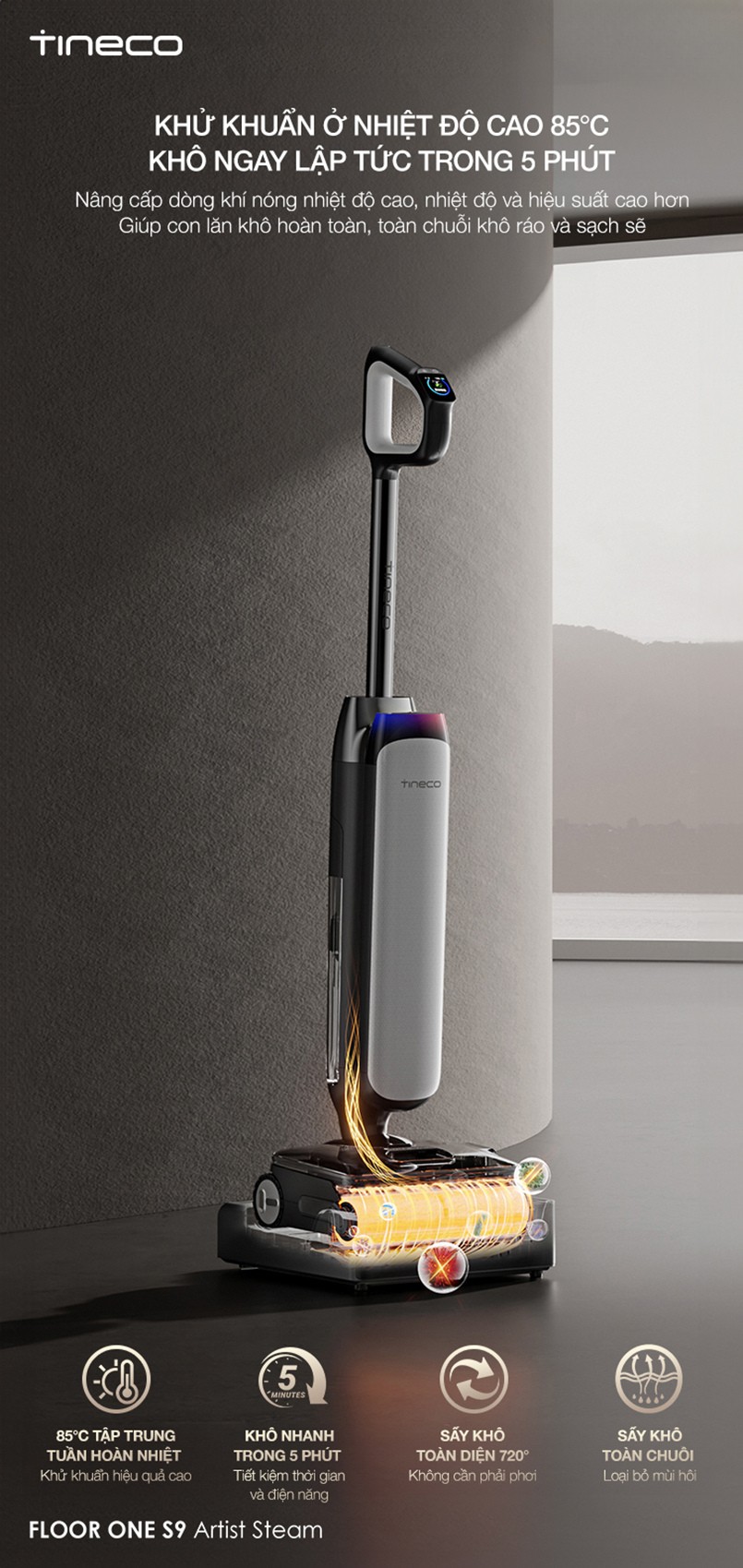 Tineco Floor One S9 Artist Steam mang đến sự làm sạch thông minh, giải phóng bạn hoàn toàn. Chỉ bằng một nút bấm sau khi lau, FlashDry tự động làm sạch sâu bên trong máy, từ đường ống đến chổi lăn. Sau đó, máy dùng khí nóng 85°C sấy khô, diệt khuẩn, ngăn nấm mốc, giữ máy luôn sạch và sẵn sàng. Thiết kế đế của Tineco Floor One S9 Artist Steam dạng kín rút ngắn thời gian sấy khô chỉ còn 5 phút, tối ưu vệ sinh và tiện lợi. Bên cạnh đó, một điểm nổi bật của chổi lăn Tineco là khả năng xoay 720 độ, cho phép làm sạch sâu và giữ cho các sợi lông luôn mềm mại, thoáng khí hơn so với các sản phẩm khác.