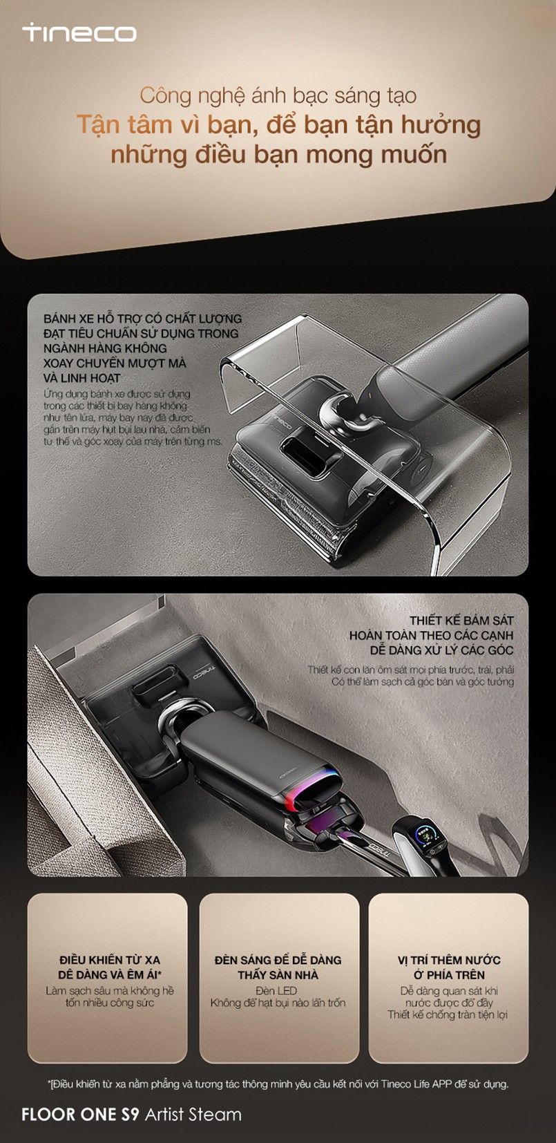 Bên cạnh đó, thiết kế của Tineco Floor One S9 Artist Steam cũng là một điểm sáng khi máy sở hữu độ dày 12.85cm và khả năng ngã phẳng 180°. Ngoài ra, máy còn có công nghệ bánh xe SmoothDrive cho di chuyển mượt mà hơn, kết hợp cùng khả năng xoay 90° vừa giảm lực cầm tay vừa mang lại sự thoải mái khi sử dụng trong thời gian dài. Kết lại, Tineco Floor One S9 Artist Steam là một sự đột phá trong công nghệ làm sạch và được đánh giá là giải pháp làm sạch toàn diện nhất từ trước đến giờ của nhà Tineco.