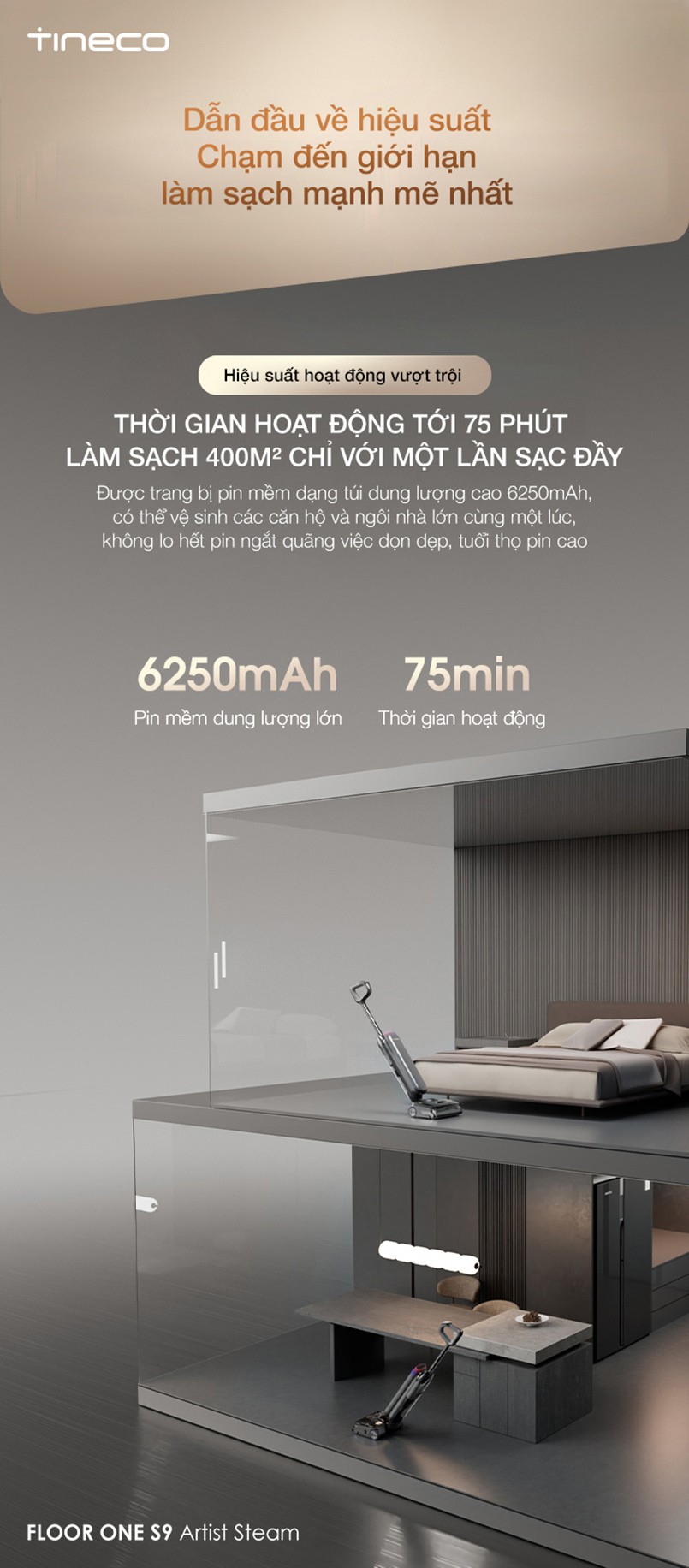Ưu điểm tiếp theo của Tineco Floor One S9 Artist Steam chính là được tích hợp gói pin mềm có dung luợng lớn lên đến 6250mAh. Dạng pin mềm này sẽ có tuổi thọ vượt trội hơn gấp 3 lần so với các thế hệ pin đời trước, đồng thời khối lượng cũng nhẹ hơn đánh kể. Nhờ đó mà việc điều hướng máy trở nên linh hoạt hơn. Dung lớn pin càng lớn thì thời gian máy Tineco Floor One S9 Artist Steam sẽ càng cao. Theo ước tính từ phòng thí nghiệm Tineco, máy có thể hoạt động liên tục lên đến 75 phút (trong điều kiện thẳng đứng). Với khoảng thời gian đó, máy có thể dọn dẹp sạch sẽ quy mô diện tích nhà lên đến 400m2 (chỉ với một lần sạc – và chỉ áp dụng trong điều kiện hút thằng đứng).
