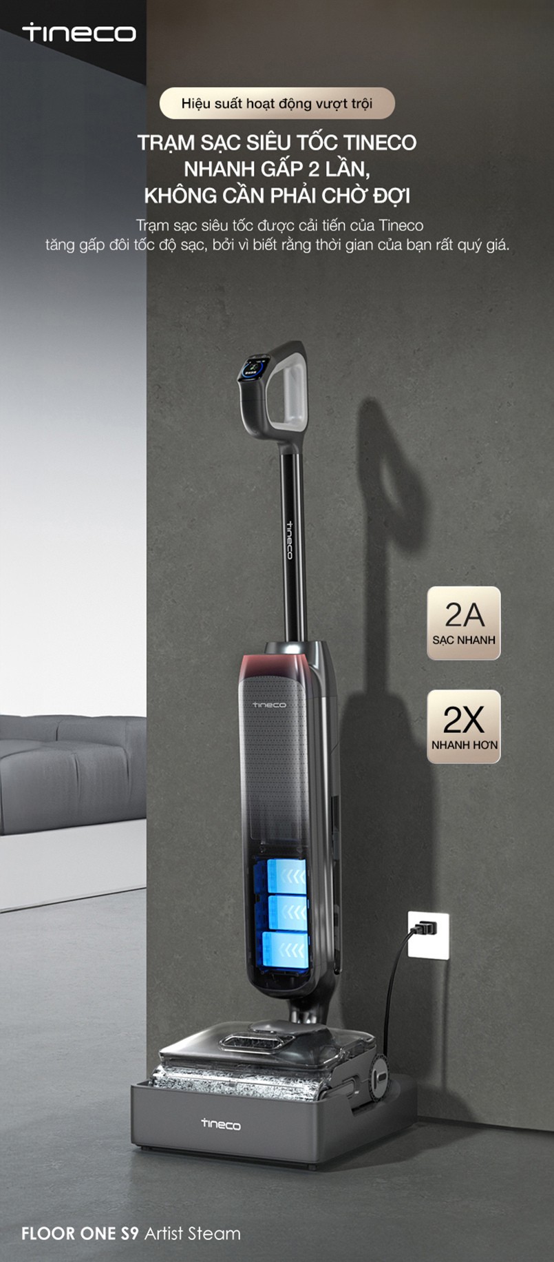 Công nghệ sạc nhanh 2A cải tiến lần đầu tiên xuất hiện giúp thời gian sạc máy Tineco Floor One S9 Artist Steam nhanh gấp 2 lần so với các đời máy trước. Bạn sẽ không phải chờ đợi trong thời gian dài cho lần làm sạch kế tiếp. Ngoài ra, máy còn được trang bị tính năng làm mát thông minh. Tính năng này sẽ tự động kích hoạt khi hệ thống mạnh điện và pin có dấu hiệu nóng lên, giúp tản nhiệt nhanh chóng, ngăn ngừa tình trạng quá nhiệt, dẫn đến hư hỏng không đáng có.