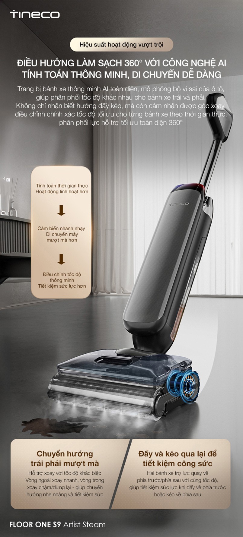 Máy hút bút khô và ướt Tineco One S9 Artist Steam có hệ thống bánh xe AI tiên tiến bậc nhất, cho khả năng làm sạch 360 độ hoàn hảo. Cụ thể hơn, hệ thống này được thiết kế mô phỏng theo bộ vi sai của ô tô, tự động phân phối tốc độ khác nhau cho bánh trái và bánh phải trong quá trình di chuyển, nhờ đó mà máy dễ dàng xoay, bẻ cua, và vượt các chướng ngại vật.