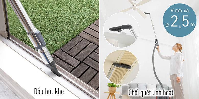 Phụ kiện đi kèm theo máy hút bụi này còn có ống hụi bụi khe và đầu chải bụi có thể tháo lắp linh hoạt, hút được nhiều khu vực, địa hình khác nhau như các khe hẹp, ghế sofa, thảm… ngay cả những chỗ hay tích bụi cũng có thể được hút sạch.