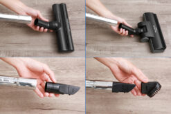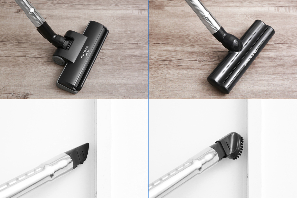 Làm sạch toàn diện mọi ngóc ngách trong ngôi nhà bạn với đầu hút sàn đa góc cạnh xoay linh hoạt, đầu hút nệm với bàn chải và ống con lăn kép hút thật sát, đầu hút khe tiện dụng