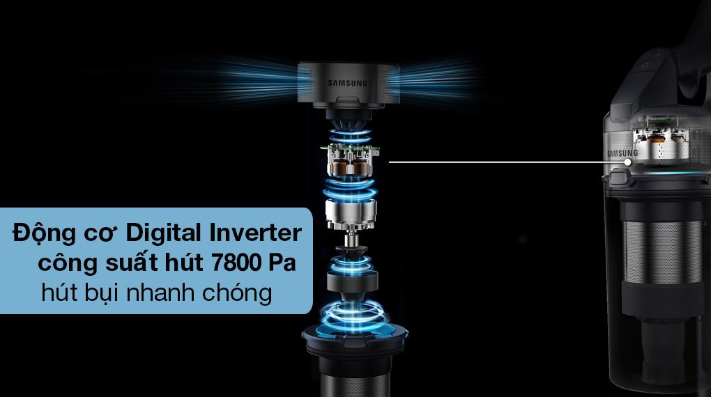 Digital Inverter mạnh mẽ tối ưu luồng khí bằng cánh quạt siêu âm, chịu tải điện năng đầu vào lớn, duy trì công suất hút 7800 Pa, giúp máy hoạt động hiệu quả trên nhiều bề mặt khác nhau để làm sạch tốt từ sàn cứng đến mặt thảm, nệm,…