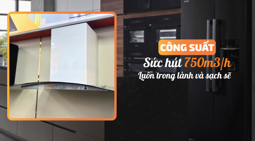Máy hút có công suất hút lên đến 750 m3/h, đảm bảo khả năng loại bỏ mùi và khói nhanh chóng, giữ cho không gian bếp luôn sạch sẽ và thoáng mát. Độ ồn khi hoạt động chỉ ở mức 55dB, giúp giảm thiểu tối đa tiếng ồn và mang lại cảm giác thoải mái cho người dùng.