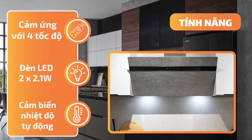Máy Hút Mùi Malloca Vita V13 Gres sở hữu thiết kế áp tường hiện đại với mặt kính gương đen bóng bẩy kết hợp cùng viền ceramic màu xi măng, tạo nên vẻ ngoài sang trọng, tinh tế và đầy cuốn hút cho không gian bếp của bạn. Thiết kế này không chỉ là một thiết bị hút mùi hiệu quả mà còn là một điểm nhấn thẩm mỹ, phản ánh gu thẩm mỹ hiện đại và đẳng cấp của gia chủ. Kiểu dáng gọn gàng, ôm sát tường giúp tiết kiệm không gian và tạo sự liền mạch cho căn bếp.