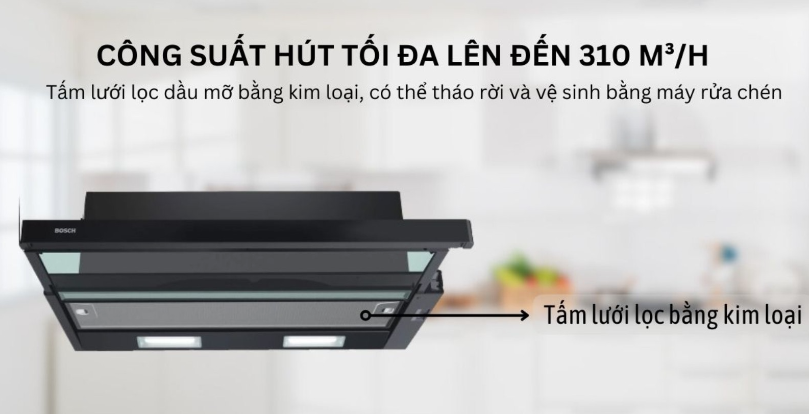 Máy hút mùi âm tủ Bosch DFT63CA61B có thể đạt đến công suất hút tối đa 310 m3/h. Mức công suất này có thể hút sạch hoàn toàn mùi và khói thức ăn, trả lại không gian trong lành cho không gian bếp gia đình