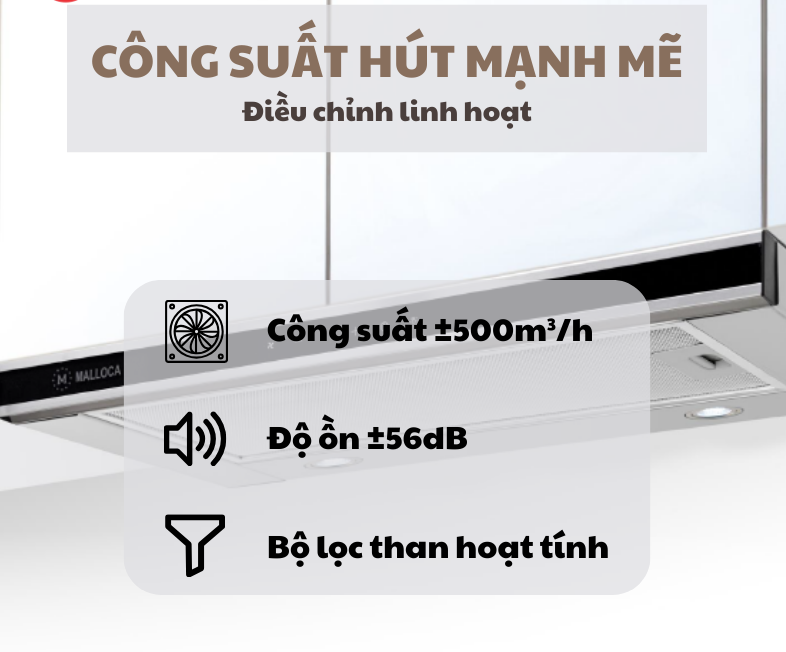 Không chỉ đẹp về hình thức, Malloca K1506 TC còn chinh phục người dùng bởi khả năng hút khử mùi mạnh mẽ. Với công suất hút lên đến 500m³/h, máy nhanh chóng loại bỏ khói, mùi thức ăn, dầu mỡ, mang lại bầu không khí trong lành cho gian bếp.