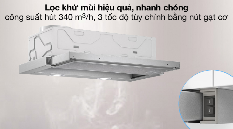 Công suất hút tối đa theo tiêu chuẩn châu Âu DIN/EN 61591m 340 m3/h, 3 tốc độ hút tùy chỉnh bằng nút gạt cơ