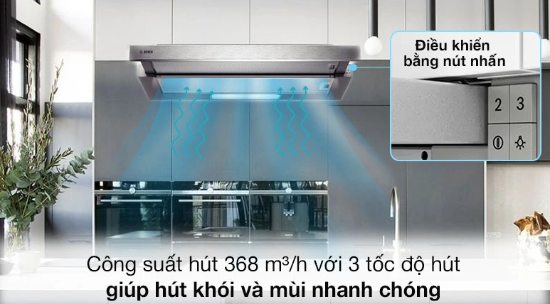 Máy hút mùi âm tủ Bosch DFT93AC50 đến từ thương hiệu danh tiếng – Bosch (Đức), công suất hút 368 m³/h với 3 tốc độ điều chỉnh bằng nút nhấn giúp loại bỏ mùi hiệu quả, đem đến cho bạn không gian nấu nướng thoáng.