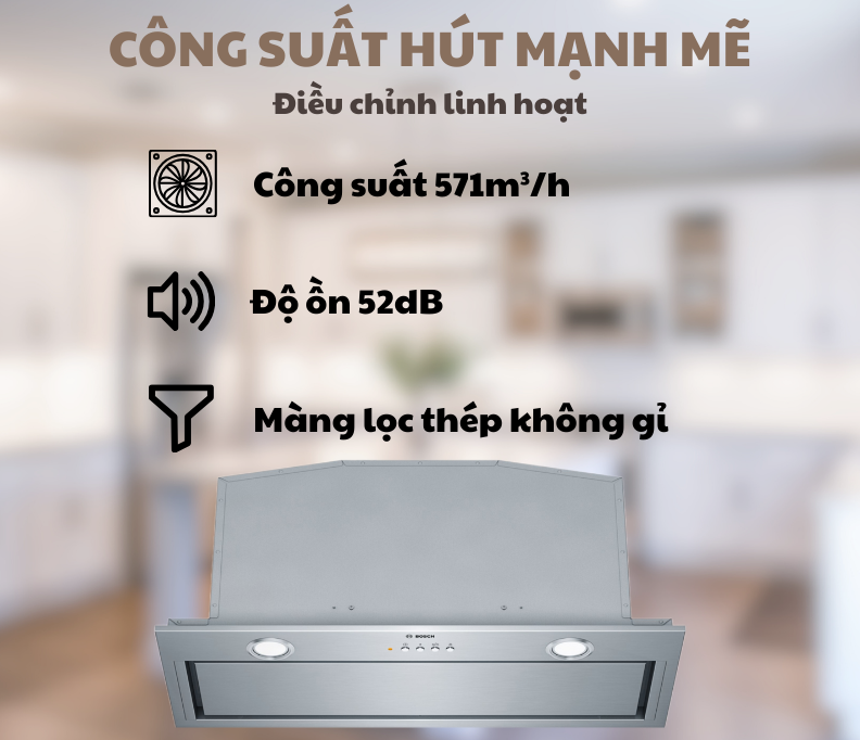 Máy hút mùi DHL785C được tối ưu về độ ồn, chỉ 46 dB ở mức công suất tối đa. Đây là một mức độ ồn rất nhỏ, không gây phiền nhiễu cho người dùng và người xung quanh. Bạn có thể yên tâm sử dụng máy hút mùi Bosch DHL785C mà không lo bị ảnh hưởng đến sức khỏe và chất lượng cuộc sống.