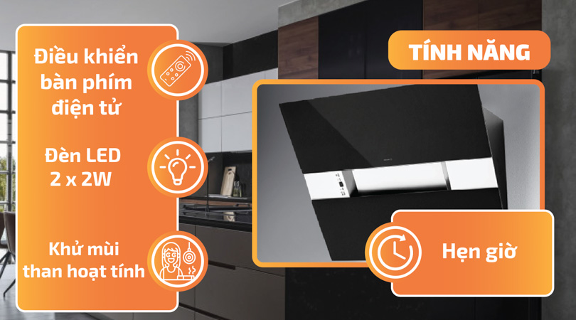 Bảng điều khiển điện tử tiên tiến và chức năng hẹn giờ tiện lợi giúp bạn dễ dàng điều chỉnh máy hút mùi theo nhu cầu của mình