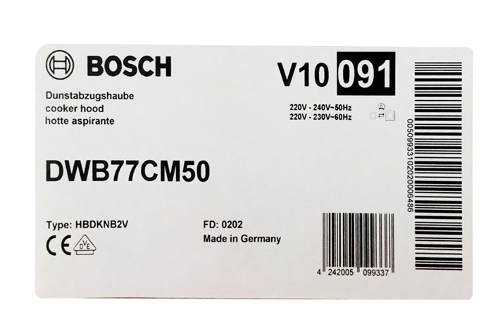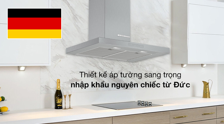 Máy hút mùi Bosch DWB77CM50 thiết kế áp tường với màu trắng xám sang trọng theo phong cách Châu Âu, được nhập khẩu nguyên chiếc từ Đức