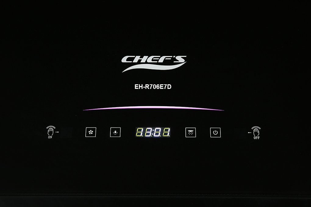 Hút Chef’s EH-R706E7D được trang bị điều khiển cảm ứng không chạm hiện đại với 6 tốc độ hút để điều chỉnh. Khi cần thay đổi các mức công suất hút, chỉ cần vẫy tay nhẹ qua vùng cảm ứng từ trái qua phải là có thể điều chỉnh, không cần chạm tay vào vùng điều khiển. Tính năng này rất tiện lợi phù hợp khi tay ướt, không cần chạm vào phím vẫn nhẹ nhàng điều khiển được hút mùi hoạt động theo ý muốn.