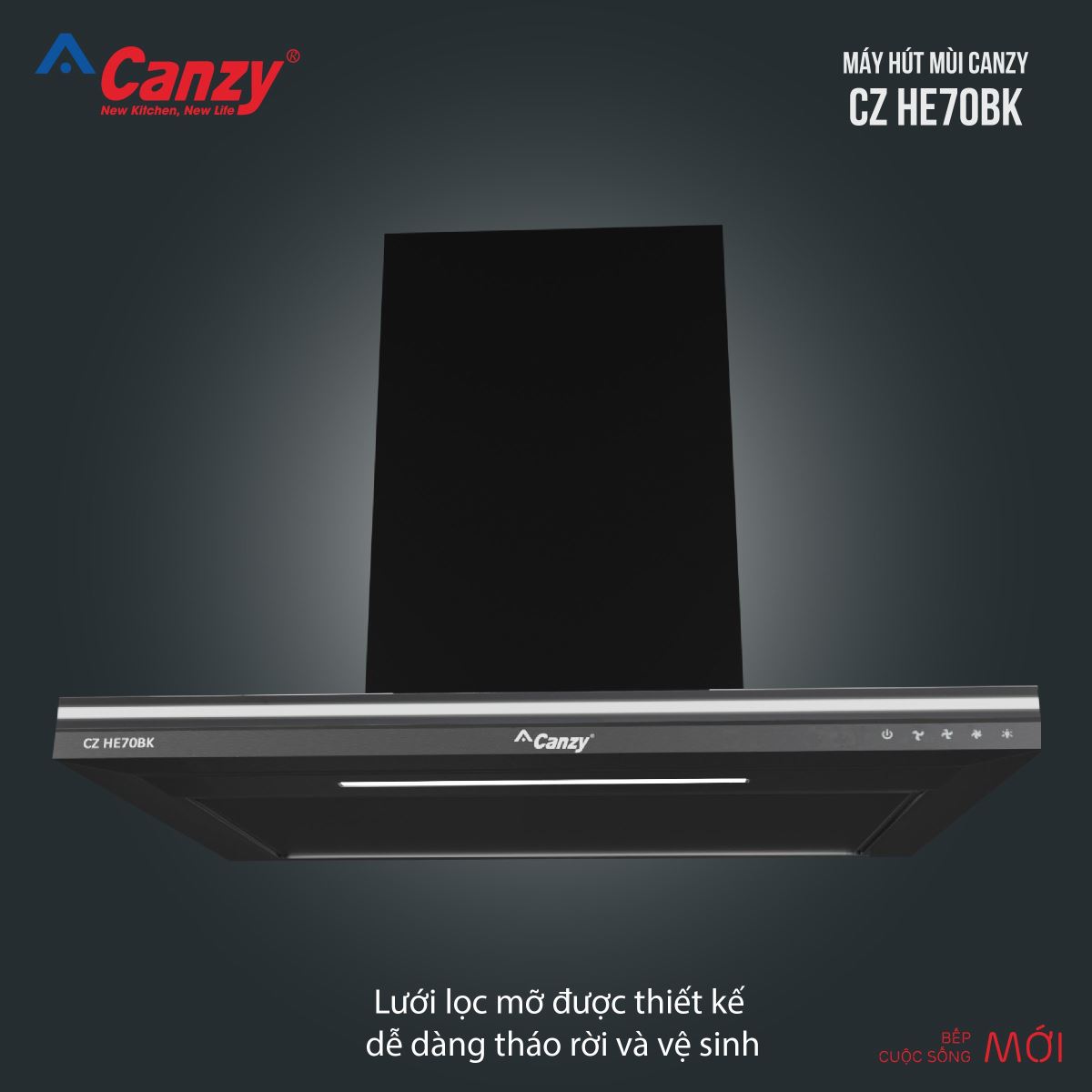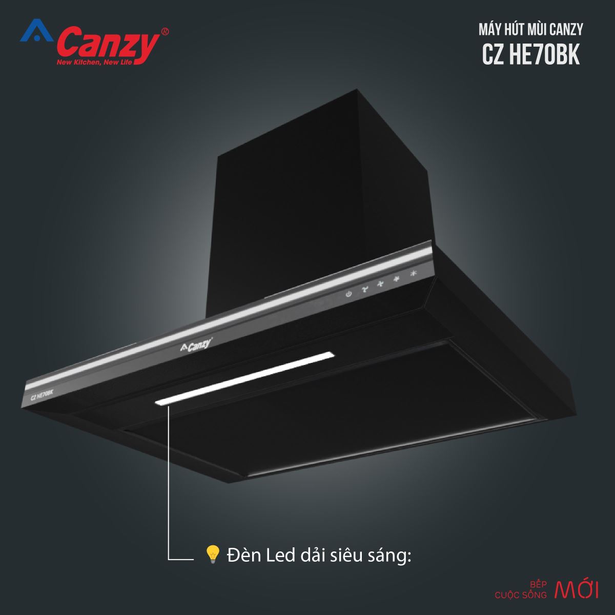 Máy hút mùi Canzy CZ-HE70BK sử dụng bảng điều khiển cảm ứng gồm 3 tốc độ hút phù hợp với lượng mùi và khói khi nấu ăn để đảm bảo sạch mùi cho không gian bếp nhà bạn. Hệ thống đèn chiếu sáng của máy gồm 1 đèn Led có tác dụng chiếu sáng và làm cho công việc nấu ăn thêm thuận lợi. Lưới lọc mỡ bằng hợp kim gồm nhiều lớp để ngăn chặn triệt để mùi, bụi lọt vào bên trong máy gây hỏng động cơ. Tấm lưới này có thể tháo rời để vệ sinh một cách dễ dàng.