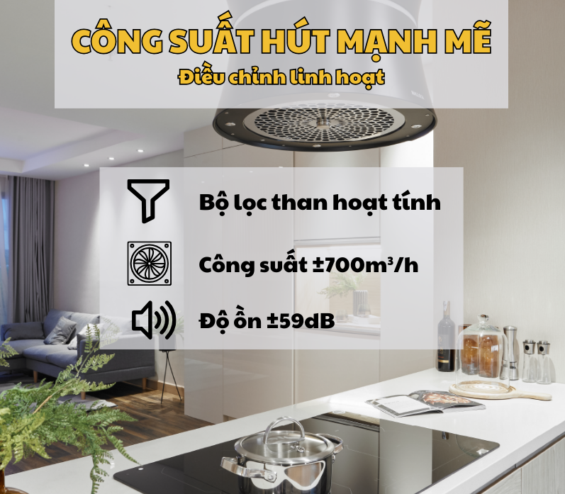 Với công suất hút 700m³/h, Malloca SOPHIE K 500B xử lý nhanh chóng khói, mùi và dầu mỡ, phù hợp cho các căn bếp rộng hoặc khu vực nấu nướng thường xuyên. Đồng thời, máy vận hành tiếng ồn chỉ 59dB (giống tiếng nói chuyện bình thường), không gây phiền nhiễu khi sử dụng.