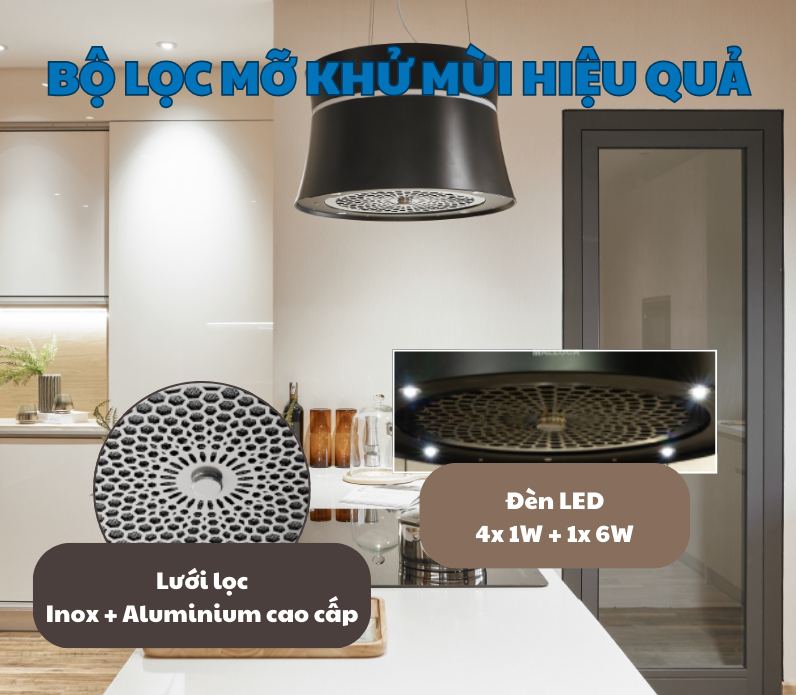Máy được trang bị 4 đèn LED công suất 1W để chiếu sáng không gian nấu nướng, đảm bảo ánh sáng đồng đều, không chói mắt. Thêm vào đó, đèn LED trang trí 6W tạo điểm nhấn sang trọng, phù hợp để làm nổi bật không gian bếp vào ban đêm.
