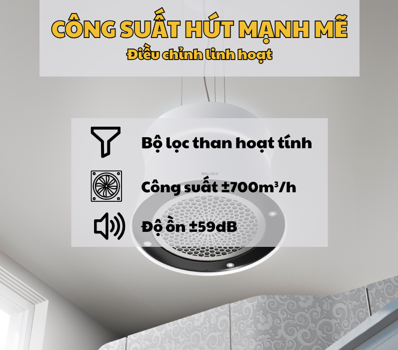 Với công suất hút lên đến 700m3/h, máy hút mùi Malloca SOPHIE K 500W dễ dàng “đánh bay” mọi mùi thức ăn, khói và hơi nước trong quá trình nấu nướng, kể cả khi bạn chế biến những món ăn có mùi nồng. Dù hoạt động mạnh mẽ, độ ồn của máy chỉ ở mức 59 dB, tương đương với tiếng ồn của một cuộc trò chuyện thông thường, không gây khó chịu hay ảnh hưởng đến sinh hoạt của gia đình.