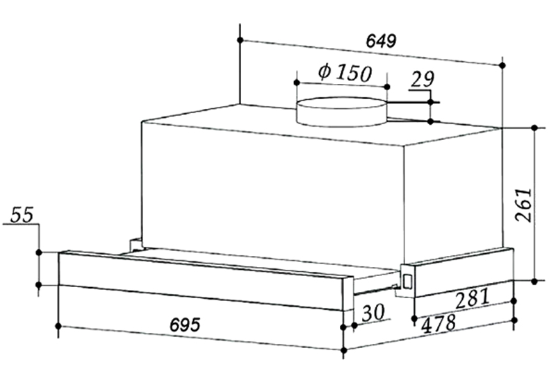 Máy hút mùi Eurogold EUH01170 có kích thước R695 x S(311-478) x C261 (mm).