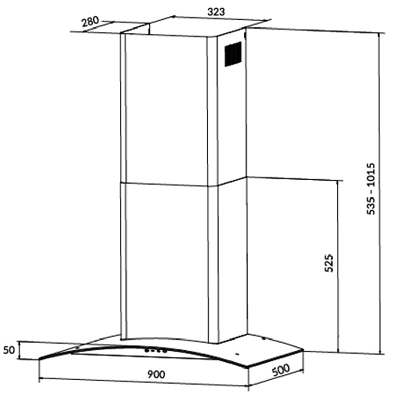 Kích thước của máy hút mùi Eurosun EH-90K26S là R900 x S500 x C(535-1015) mm.