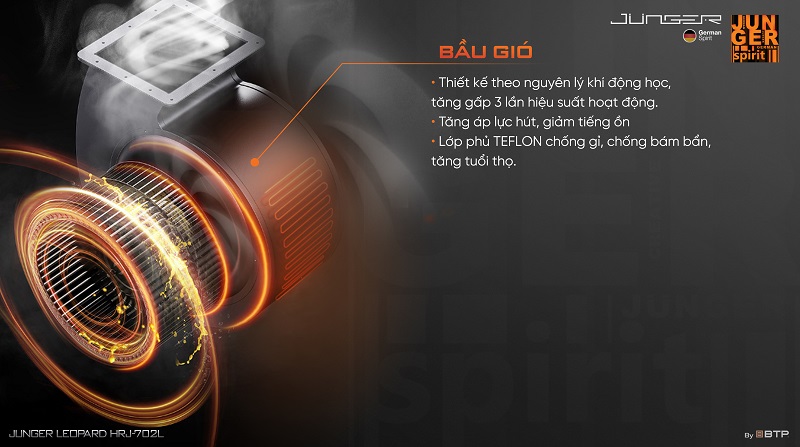Máy hút mùi Junger Leopard HRJ-702L sở hữu cánh quạt kim loại Aerowing được thiết kế đặc biệt theo công nghệ khí động học của NASA với lớp phủ Teflon hoàn thiện cao cấp, mang đến hiệu quả hoạt động vượt trội: