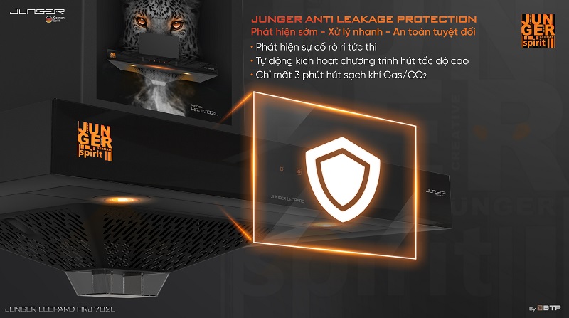 - Công nghệ Junger Anti Leakage Protection – chống rò rỉ khí Gas, CO2: Khi kích hoạt tính năng này ở chế độ hoạt động tự động, cảm biến khí gas và khí CO2 sẽ luôn ở trạng thái ON giúp phát hiện sự cố rò rỉ gas, cháy nổ tại thời điểm sớm nhất. Lúc này, máy sẽ tự kích hoạt chương trình hút tốc độ cao để hút toàn bộ khí độc đẩy ra bên ngoài, giúp ngôi nhà của bạn luôn trong trạng thái được bảo vệ an toàn.