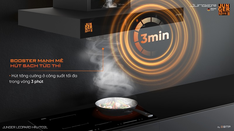 Chế độ Booster: máy sẽ ngay lập tức chạy ở chế độ hút mạnh nhất trong 3 phút để loại bỏ triệt để khói, mùi thức ăn. Sau 3 phút, máy sẽ tự động chuyển về tốc độ thấp hơn, đảm bảo hiệu quả hút sạch và tiết kiệm điện năng.