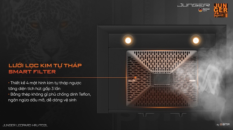 Lưới lọc Smart Filter được thiết kế hình Kim tự tháp Giza ngược với 4 mặt tiếp xúc, làm tăng tiết diện hút khói lên gấp 3 lần, giúp khử mùi nhanh chóng và hiệu quả. Bề mặt lưới được sơn tĩnh điện phủ lớp hoàn thiện Teflon giúp tăng khả năng chống bám dính, chống oxy hóa và chống gỉ sét vượt trội, đảm bảo độ bền bỉ trong môi trường nóng ẩm, nhiều dầu mỡ và hơi nước.
