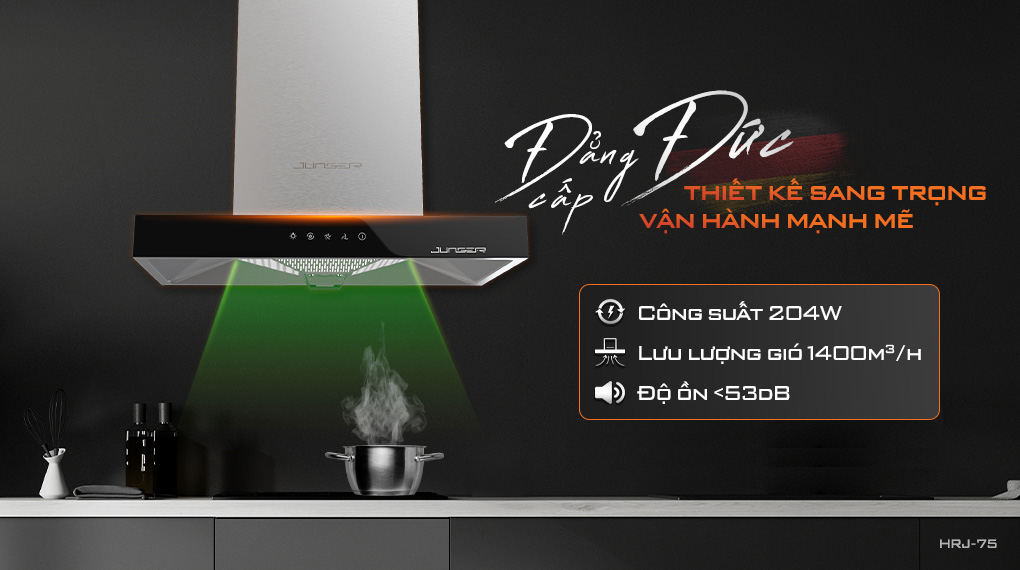 Junger HRJ-75 sở hữu động cơ AC thế hệ mới chống hơi nước siêu yên tĩnh kết hợp quạt gió động cơ dạng tuabin phát ra âm thanh dưới 53dB ngay cả khi hoạt động ở mức công suất mạnh nhất. Lực hút 1400m3/h nhanh chóng làm sạch bầu không khí trong khu vực nấu nướng, loại bỏ đến 99% mùi dầu mỡ và mùi thức ăn khó chịu.